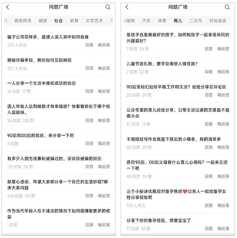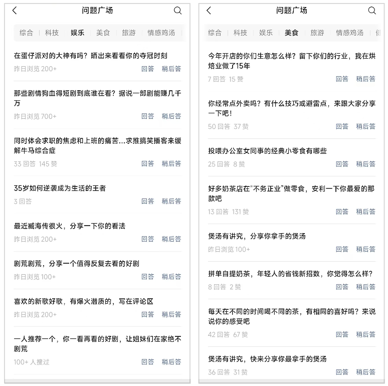 在问题广场里各个领域下面都有很多问题,大家进入后可以多点一下去看看,找一些自己感兴趣的去回答,每天上下班路上或者工作累了,想摸鱼的抽个三五分钟时间就能回答一个问题。